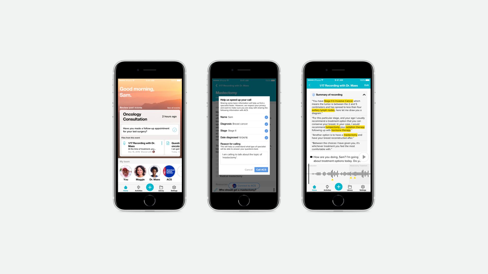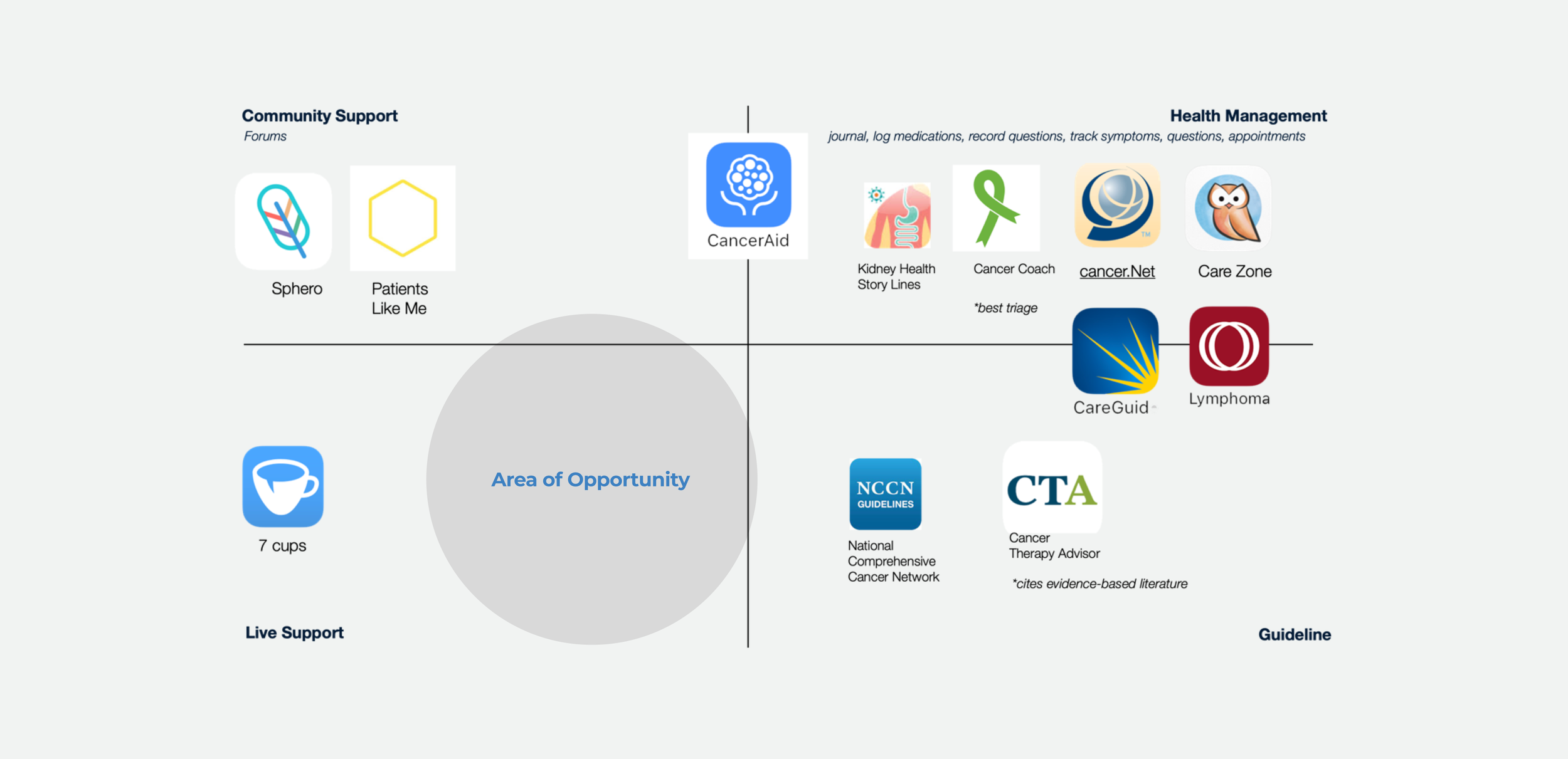 I created a competitive analysis deck for the team, selecting cancer mobile applications with the best reviews. We had discussions on the different patterns and ideas which gave us both inspiration and helped us understand the opportunity in the market.