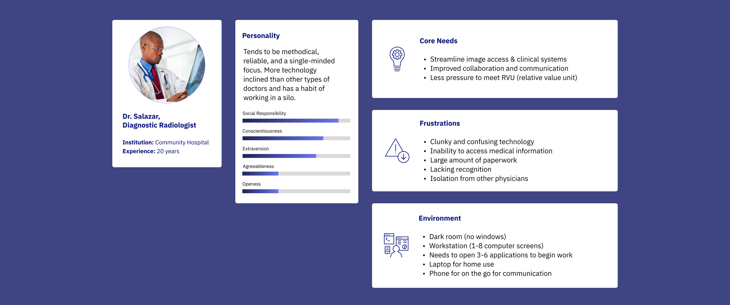 I spearheaded a remote design workshop to understand our design scope and align expectations. I simultaneously created relationships with a group of Radiologists and our onsite Radiologist subject matter expert. We decided our focus would be Radiologists and the PACS Admin (aka, a Radiologist’s personal IT person that helps to navigate the complex system).
