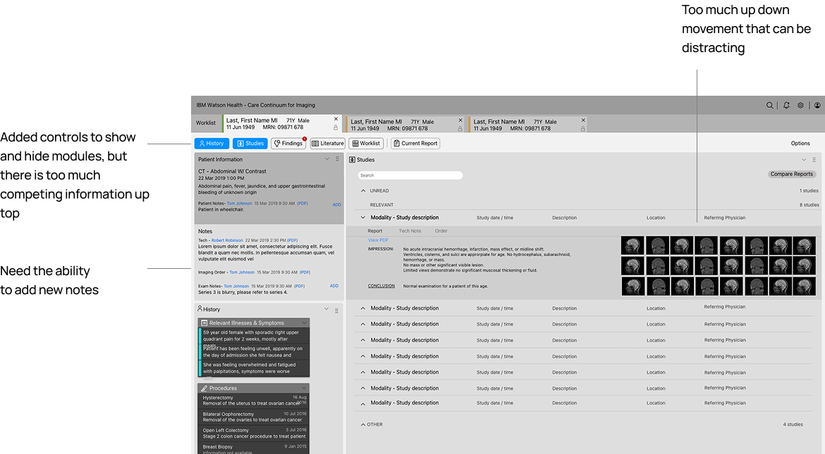 To think big, there were no limitations. I ran bi-weekly sessions with a key radiology stakeholder to get his expertise as we came up with concepts, we started from wireframes and worked toward mid-fi.