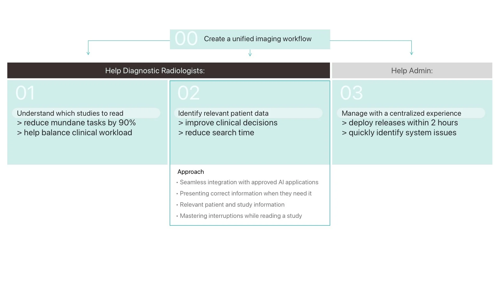 Radiologists read about 300-400 studies a day. Deep diving into how they approach reading a study, gives key insight into the information we need to prioritize, and the type of experience they need. Traditionally, each touchpoint represents a different product.