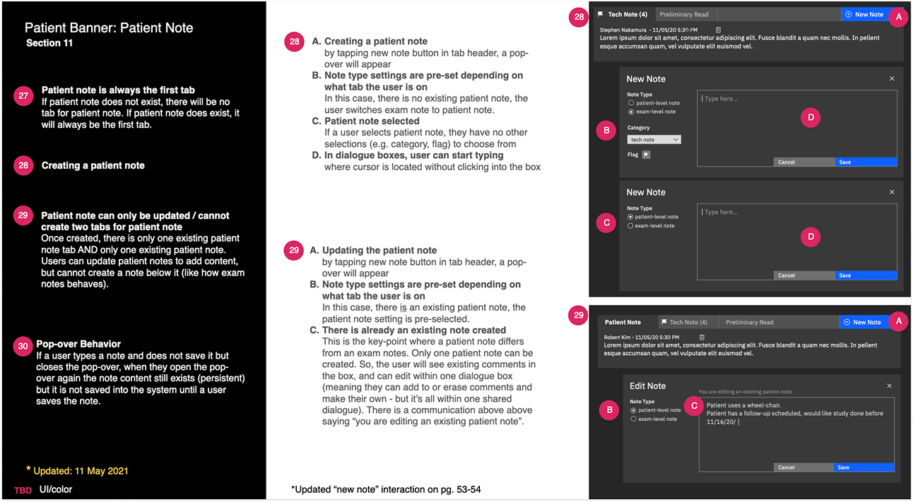 As we had a hard dead line approaching as wanted to display a concept of the work at RSNA, a radiology conference, we needed to work fast; but we were still iterate the design and getting feedback from the team. There were about 15 developers working on this. We only worked closely with the front end developers so we need to communicate our designs very clearly, and this is an example of how I communicated interactions that happens when a user is creating a patient note within the patient page.