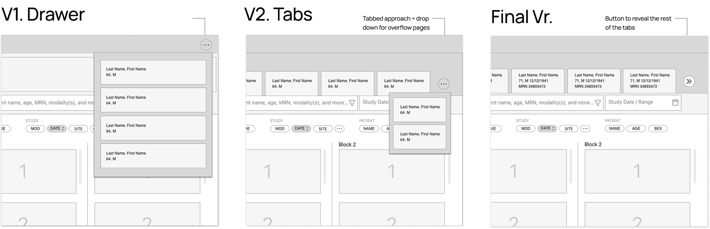 For overflow, I did use a drawer. we didn't have this pattern existing in our design system, a developer told it would cost about $10,000 annually to maintain a year - and I decided that wasn't a good tradeoff for us. So I evolved the navigation the final version where you tap a button to see more. TABS: If multiple studies are opened, users wanted necessary identifiers to distinguish between exams, so we added their birthdate as well as their age and if they are female or male.
